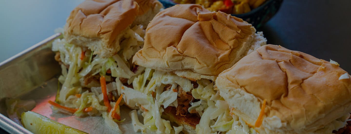 1 brisket, 1 chicken, & 1 pulled pork slider. Topped with slaw